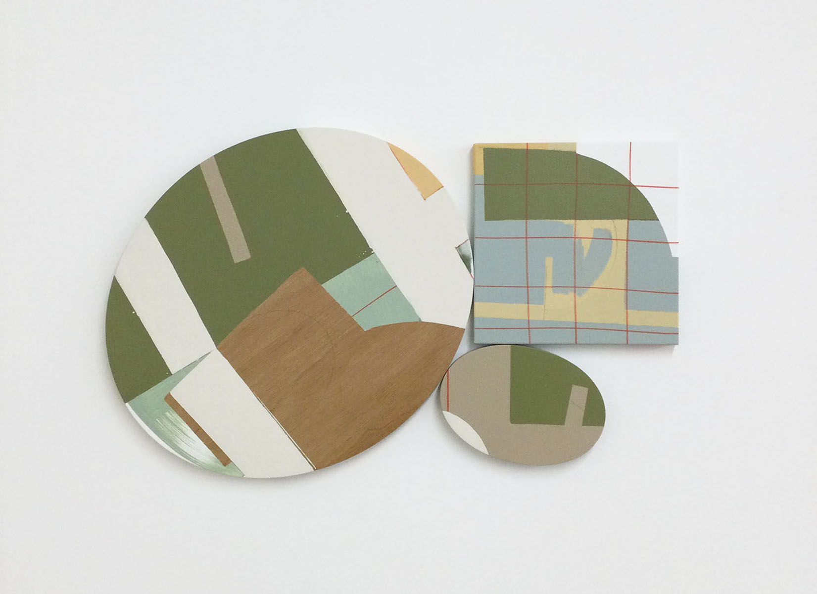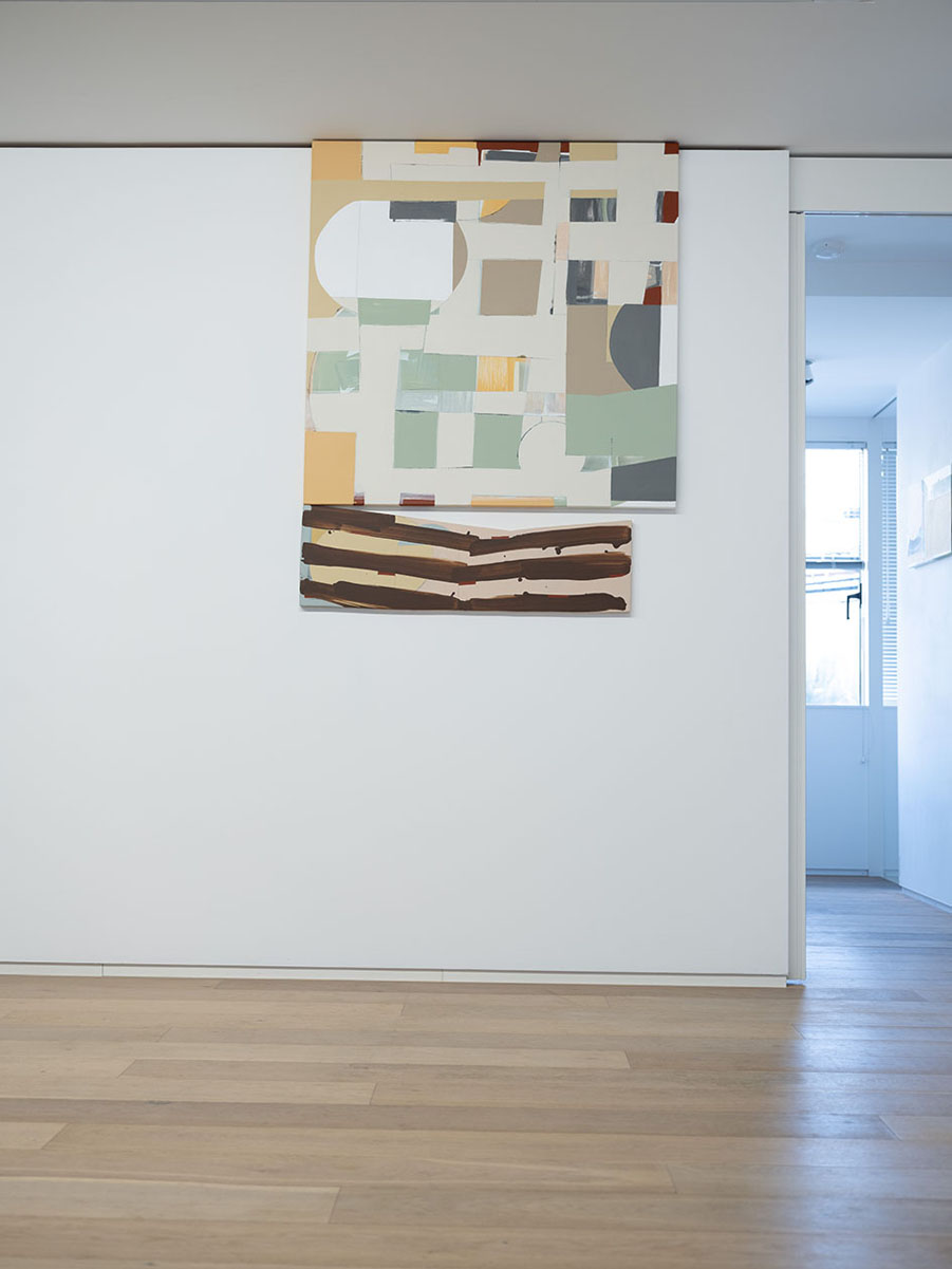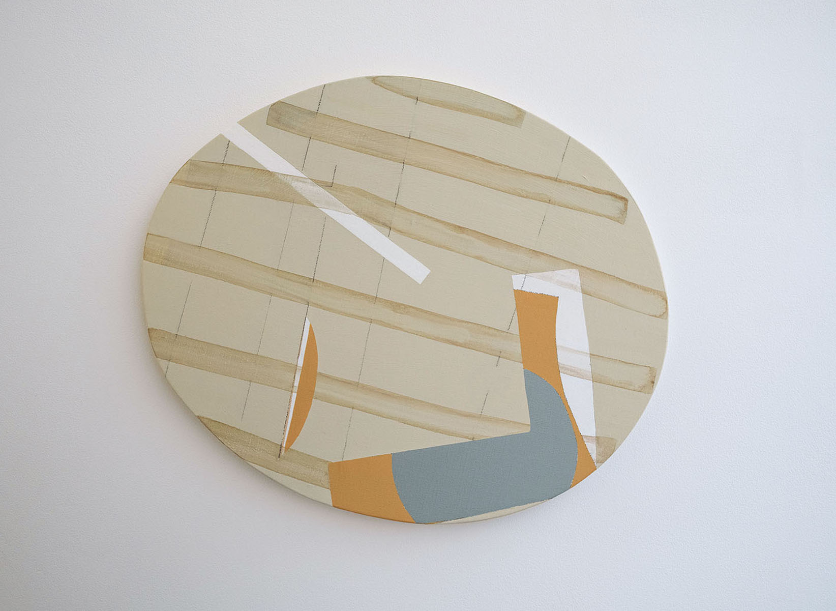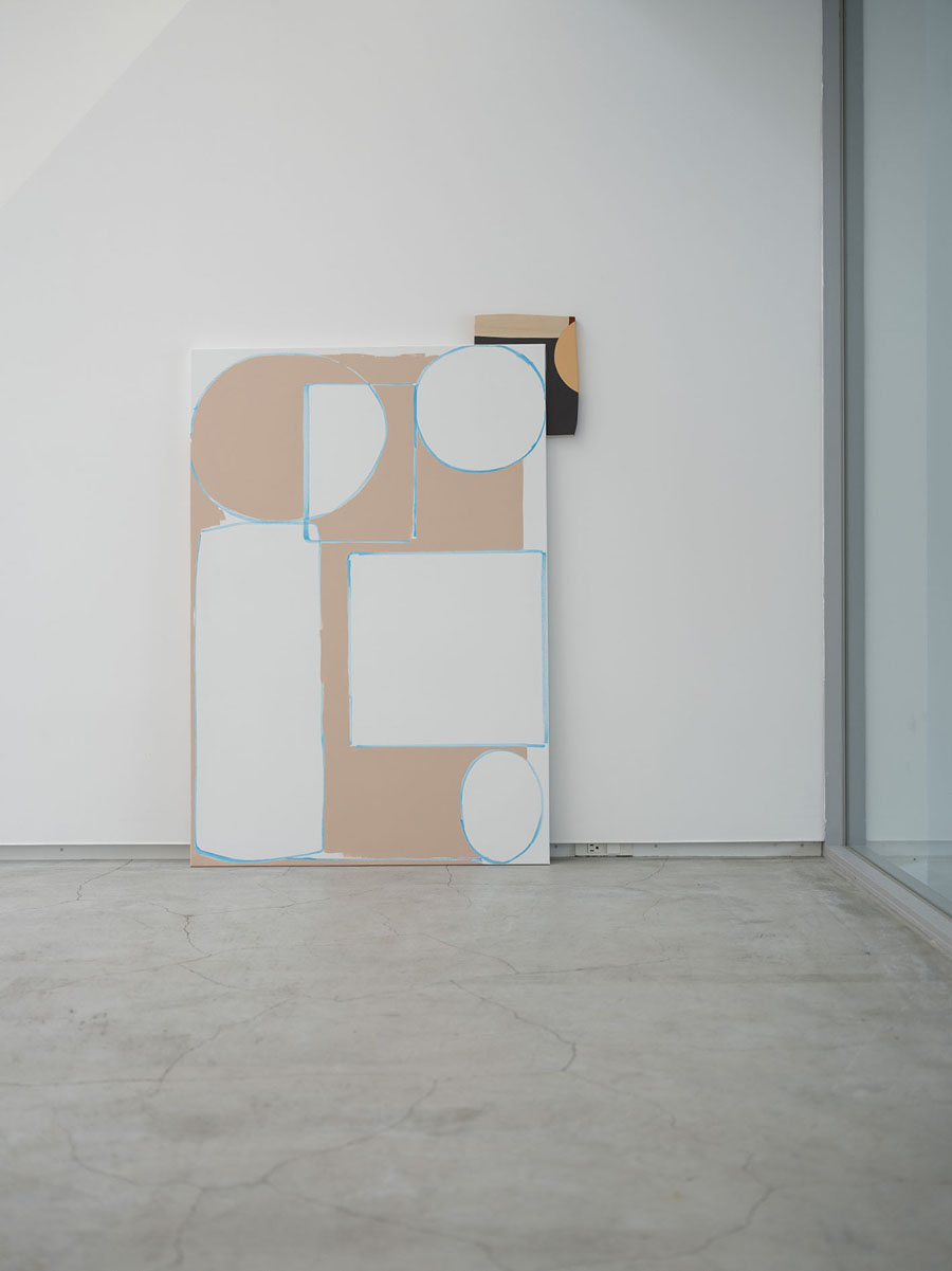 This time, as a rule, I decided to use the outline of a support as a guide when drawing lines on a different support and let each support (such as canvas or panel) become independent while interfering to each other. What is drawn on the support as a motif is the outline of another support – vice versa could happen and repeat replacement. This is realized through correlation and is replaceable, somewhat tricky, which keeps our point of view unsettled from particular piece or color.