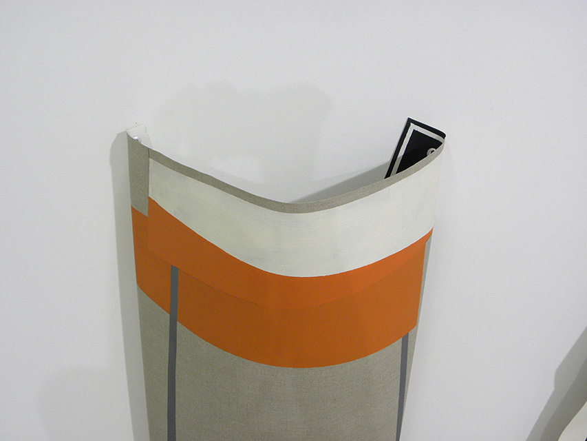 作品をつくる前に、作品を設置する際に壁に打つ釘の幅を任意で40cmと決める。キャンバスにハトメが付いているが、ハトメの位置が必ずしも40cm幅ではない為、たわみ、届かない場合もある。